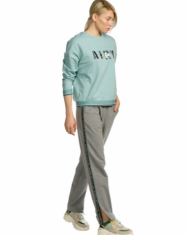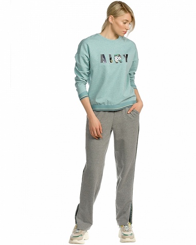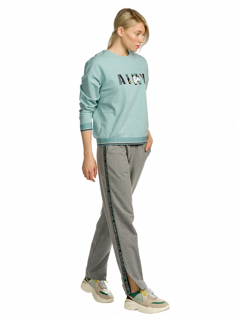 Комплект женский: толстовка и брюки. НОВИНКА! Свитшот комфортного объема. Фактурный шрифтовой принт с объемным декором и металлизированной посыпкой. Перевод: "Воздушная". По низу рукавов пришиты манжеты из рибаны с полосками. Трикотажные брюки нового современного кроя, карманы в боковых швах. Брюки-трубы, небольшого объема с разрезами сбоку и декоративной тесьмой по боковому шву. Состав: верх: 96%хлопок 4%эластан, низ: 96%хлопок 4%эластан