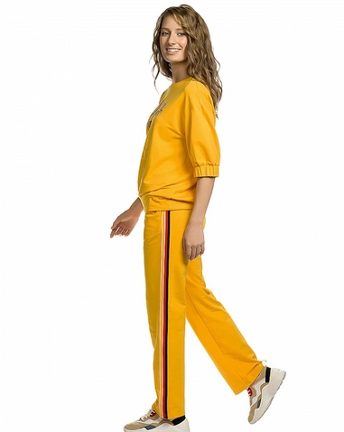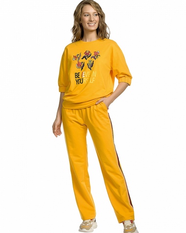 Комплект женский: толстовка и брюки. НОВИНКА! Футер в комбинации с тонким трикотажем на манжетах рукавов. Крупные сборки на манжетах - благодаря широкой внутренней резинке. Стойкий эластичный принт. Перевод: "Верь в себя. Будь собой". Брюки с карманами, прямые от бедра. Лампасы из репсовой ленты. Состав: верх: 75%хлопок 20%полиэстер 5%эластан, вставка: 57%хлопок 38%полиэстер 5%эластан, низ: 75%хлопок 20%полиэстер 5%эластан
