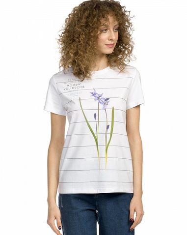 Футболка женская. Футболка прямого силуэта умеренного объема, втачной рукав. Аккуратный вырез горловины. Мягкий стойкий soft-принт. Перевод: "Красота начинается в тот момент, когда ты решаешь быть собой". Состав: 95%хлопок 5%эластан