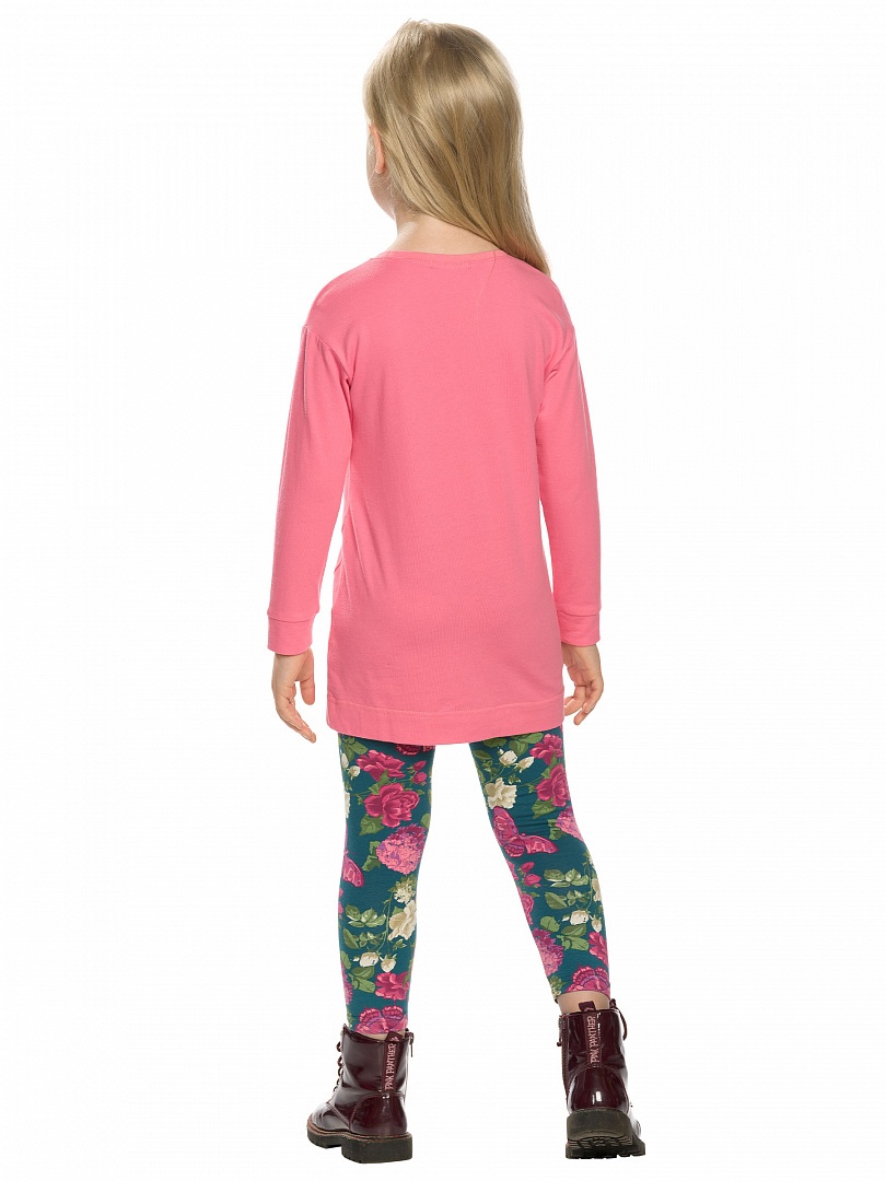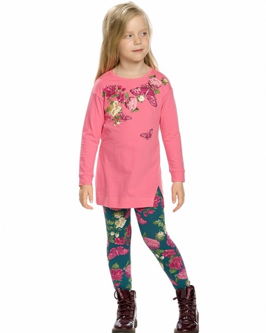 Комплект для девочек: туника и лосины. Туника со слегка спущенным плечом; по низу рукавов притачная манжета; декоративный шов с разрезом по переду изделия. Лосины в цветочный алловер принт. Состав: верх: 100%хлопок, низ: 95%хлопок 5%эластан