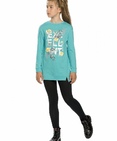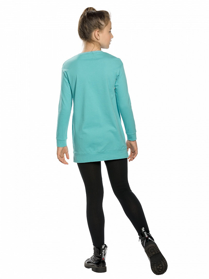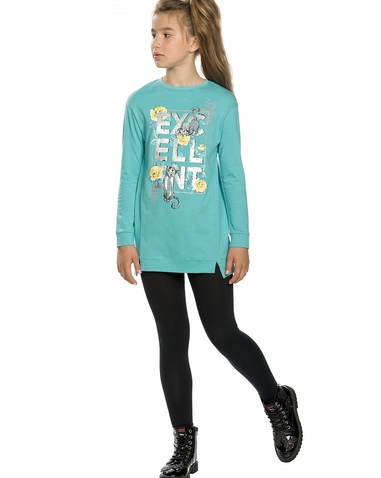 Комплект для девочек: туника и лосины. Туника прямого силуэта, слегка зауженная к низу; спинка ниже переда; боковые швы переведены на перед; по низу изделия притачные детали разной ширины, которые образуют разрезы на уровне рельефов переда; центральный принт в сочетании двух блесков: гладкого и фактурного в виде посыпок с надписью "Превосходный". Классические однотонные лосины. Состав: верх: 100%хлопок, низ: 95%хлопок 5%эластан