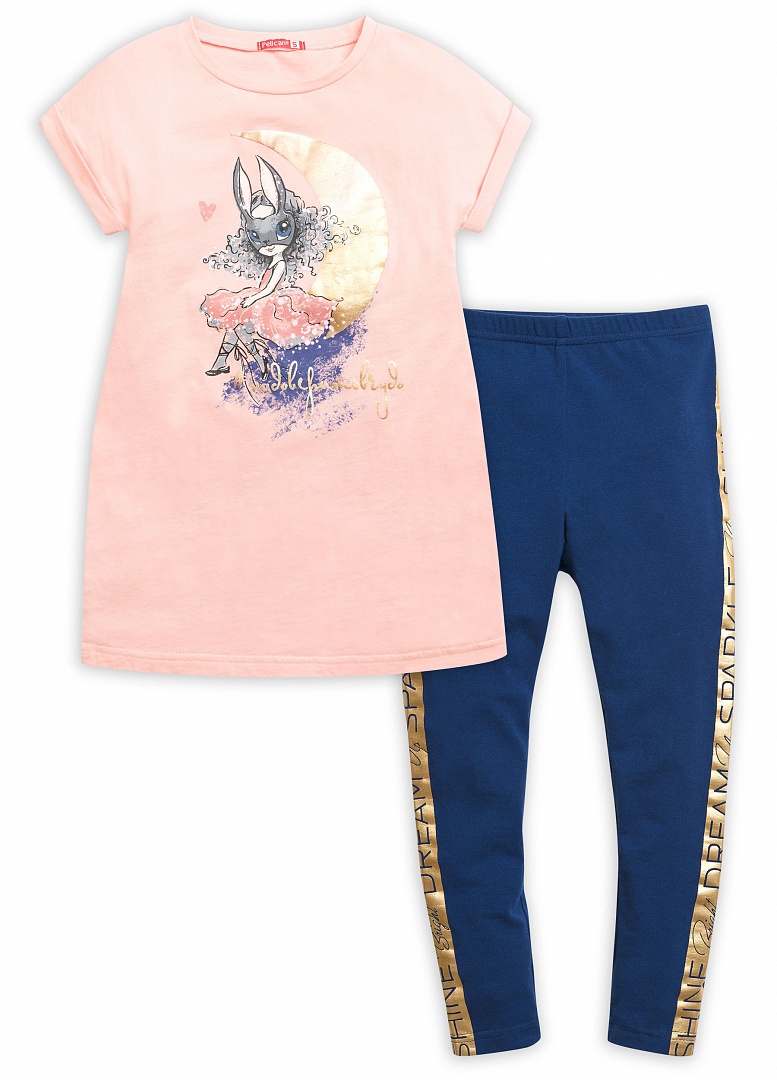 Комплект для девочек: туника и брюки. Туника: силуэт небольшая трапеция, рукав цельнокроенный, прочный Soft-принт c мерцающим золотом. Лосины: тонкий стрейч, талия на комфортной внутренней резинке (ширина 2.5 см), мягкий прочный SOFT-принт золотом - имитация лампасов. Состав: верх: 100%хлопок, низ: 93%хлопок 7%эластан