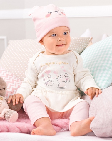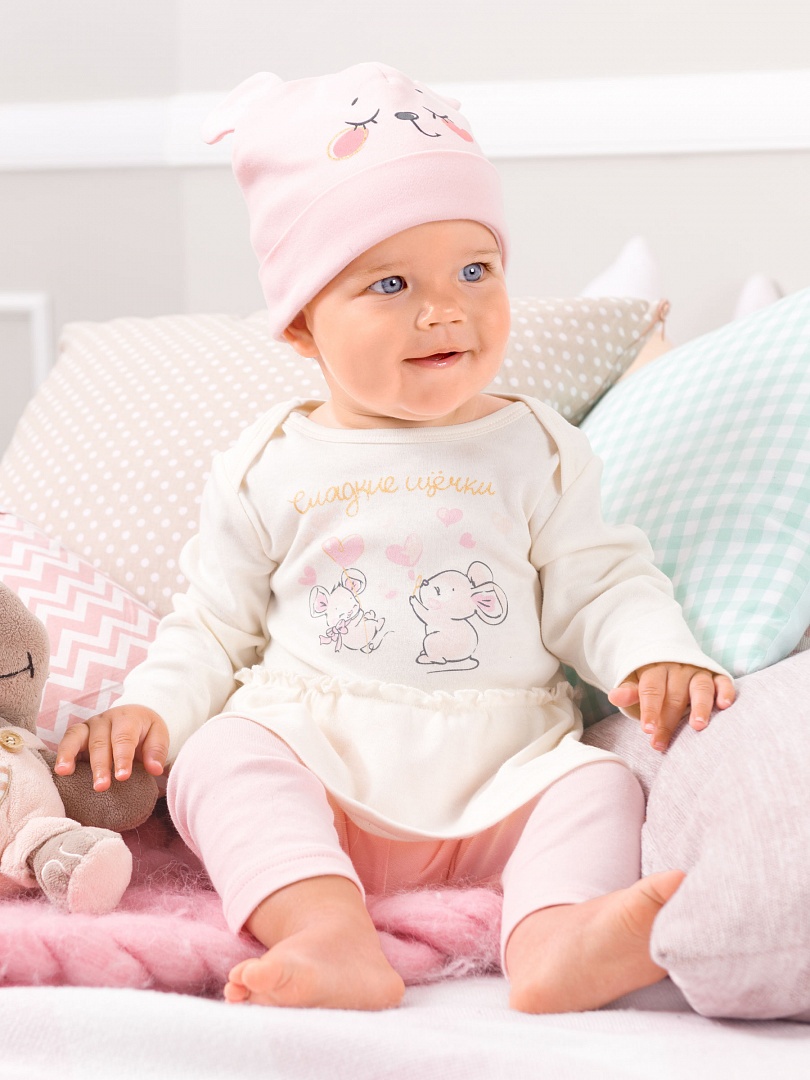 Комплект для девочек: боди и лосины. Боди с длинным рукавом, по линии талии широкая рюша, имитирующая юбочку. Центральный принт с золотом: милые мышата и надпись "Сладкие щёчки". Специальная форма выреза горловины позволяет легче и быстрее надевать полукомбинезон на малышку. Застёжка на кнопки по низу изделия. Классические лосины нежного розового цвета. Состав: верх: 100%хлопок, низ: 100%хлопок