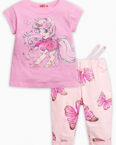 Комплект для девочек: футболка и бриджи. Футболка нового полуприлегающего силуэта уменьшенного объема; горловина и манжета рукава из рибаны. Бриджи с регулировкой обьема по талии внутренним шнурком. Состав: верх: 100%хлопок, низ: 95%хлопок 5%эластан