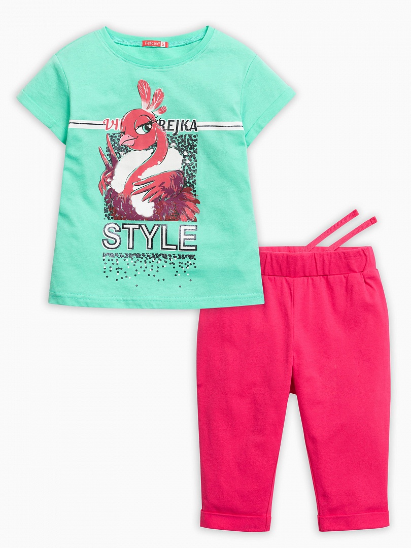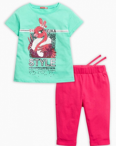 Комплект для девочек: футболка и бриджи. Футболка - графичный принт с мерцающим блеском; перевод принта "Выпендрежка.Стиль." Состав: верх: 60%хлопок 40%полиэстер, низ: 95%хлопок 5%эластан
