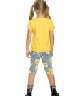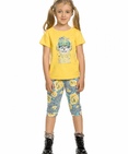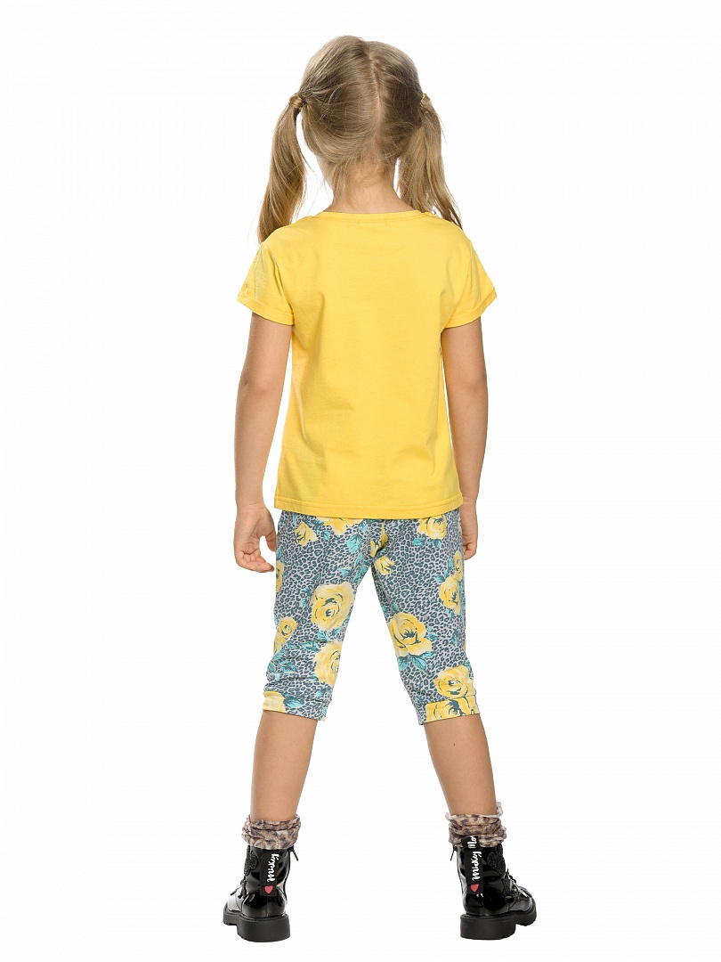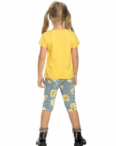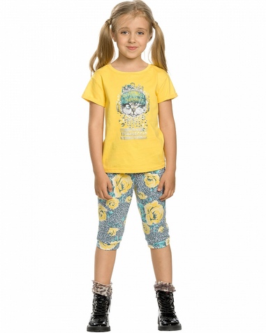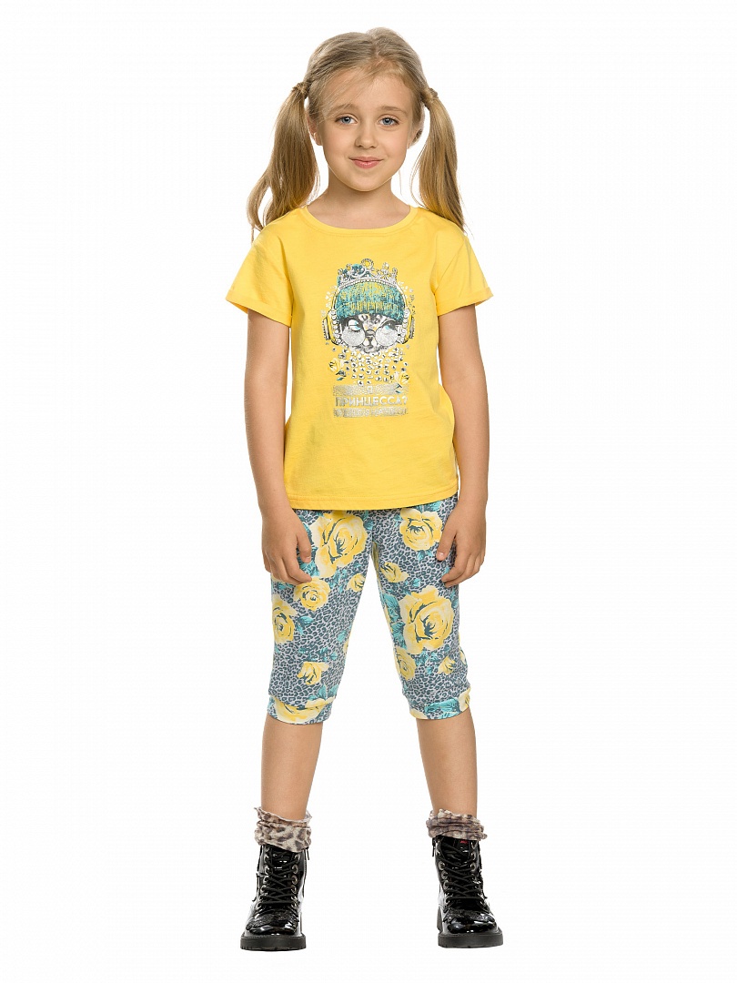 Комплект для девочек: футболка и бриджи. Футболка умеренного объёма. Центральный принт с сочетанием двух блесков: гладкого и фактурного в виде посыпки и надпись "Я принцесса? Однозначно!". Бриджи в алловер принт: микс леопардовых пятен с крупными яркими живописными розами; по низу брючин притачная манжета из основной ткани. Состав: верх: 100%хлопок, низ: 95%хлопок 5%эластан