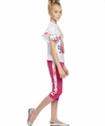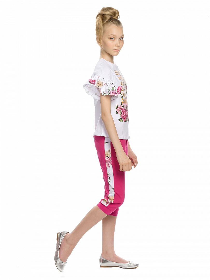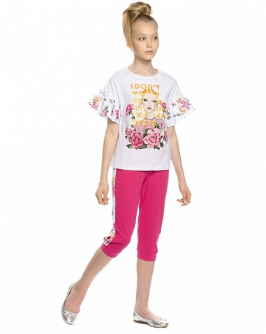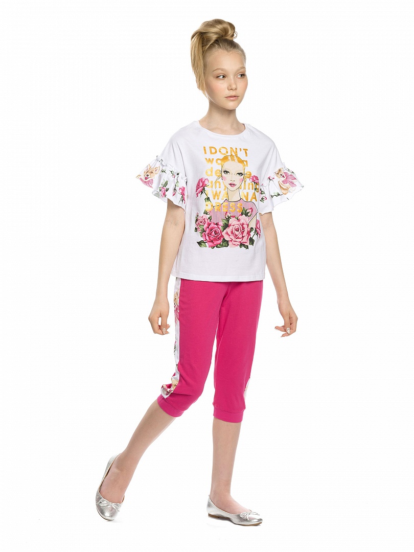 Комплект для девочек: футболка и бриджи. НОВИНКА КРОЯ! Футболка более свободного силуэта, со спущенным плечом и настрочной рюшей; перевод принта "Я не хочу ничего решать, я хочу платье". Бриджи с регулировкой объёма по талии внутренним шнурком; по бокам изделия декоративный лампас Состав: верх: 100%хлопок, низ: 60%хлопок 40%полиэстер