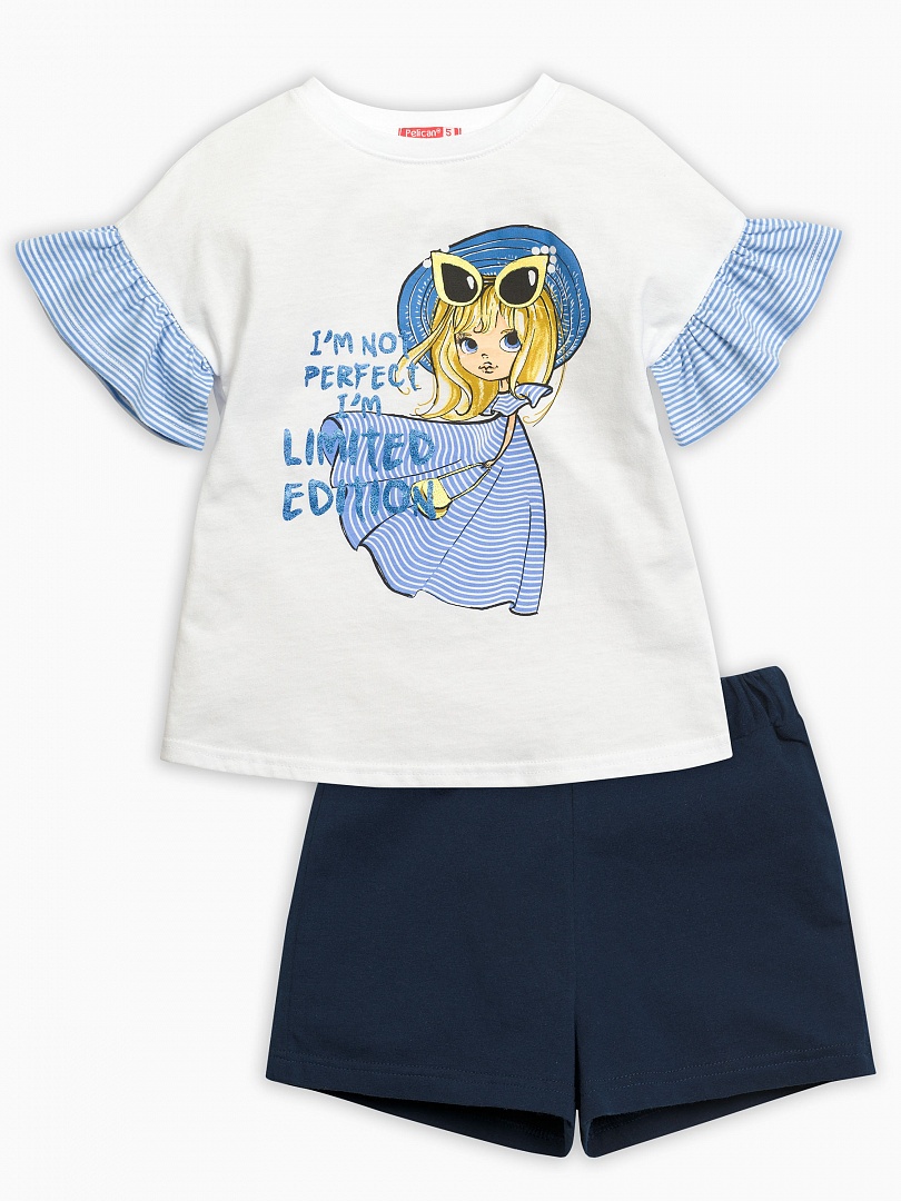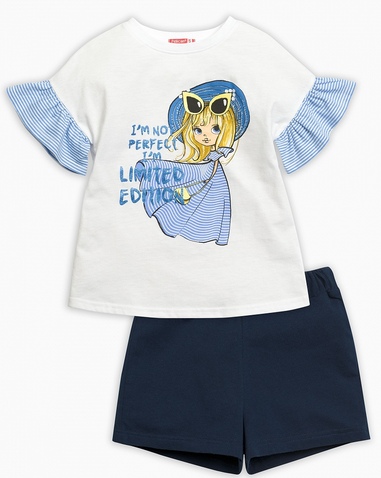 Комплект для девочек: футболка и шорты. Новый трикотаж, мягкий и пластичный. Свободный силуэт, рукав цельнокроенный, с воланом. Стойкий мягкий soft-принт с блестками, не резиновый, перевод "Я не совершенство, я лимитированного выпуска". Шорты среднего объема, в поясе- внутренняя широкая резинка и шнурок. Состав: верх: 60%хлопок 40%полиэстер, низ: 95%хлопок 5%эластан