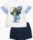 Комплект для девочек: футболка и шорты. Новый трикотаж, мягкий и пластичный. Свободный силуэт, рукав цельнокроенный, с воланом. Стойкий мягкий soft-принт, не резиновый, перевод "Я просто хорошая девочка с плохим манерами". Шорты среднего объема, в поясе- внутренний шнурок. Состав: верх: 60%хлопок 40%полиэстер, низ: 95%хлопок 5%эластан