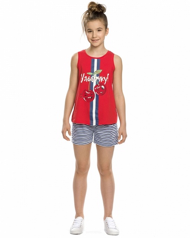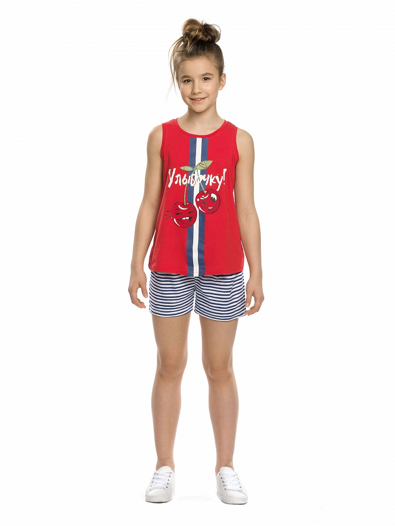 Комплект для девочек: майка и шорты. Майка умеренного объёма, силуэт трапеция; текст принта с голографической посыпкой. Шорты с защипами по переду, с регулировкой по поясу Состав: верх: 100%хлопок, низ: 100%хлопок
