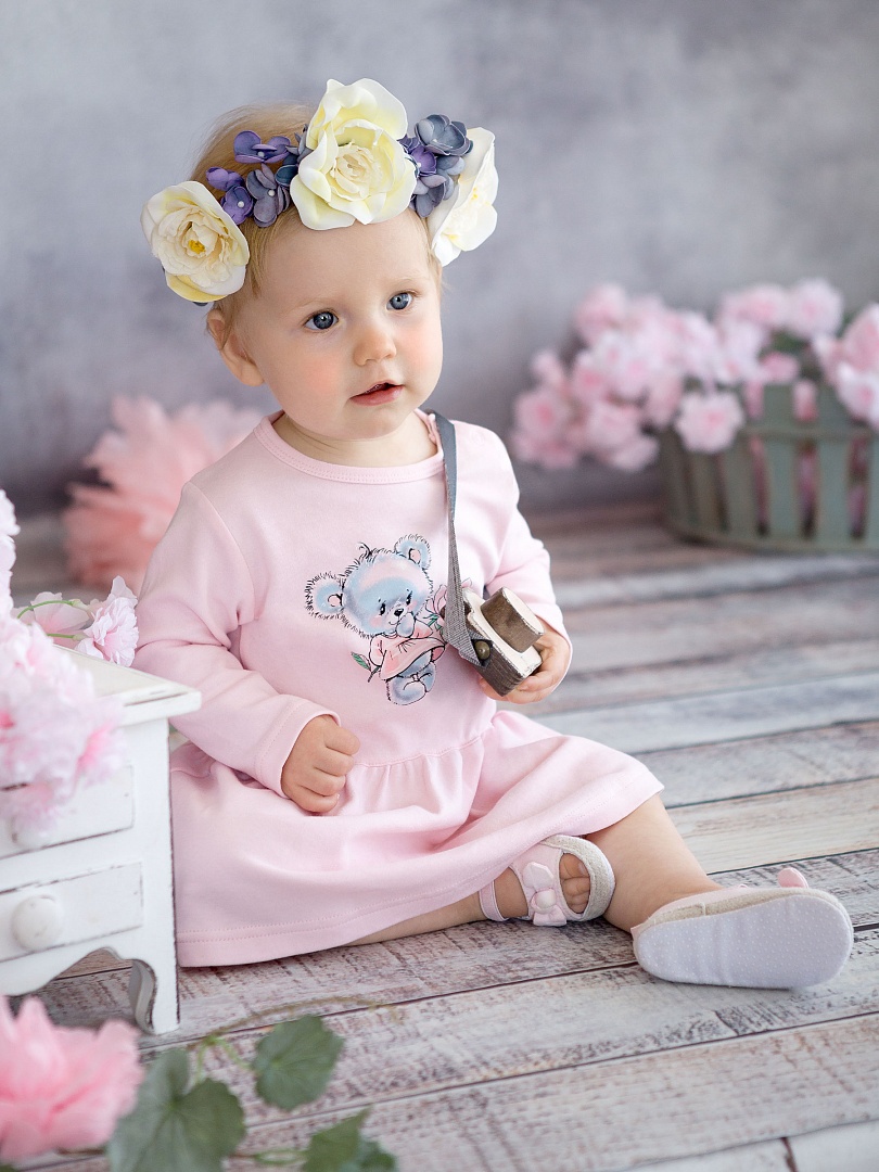 Платье для девочек. Новая модель! Полуприлегающий силуэт в верхней части платья и юбка полусолнце. Фигурное членение по линии талии с перепадом длин спинки и переда. Центральный принт в виде милого медвежонка. На плече застёжка на две кнопки для удобства надевания. Состав: 100%хлопок