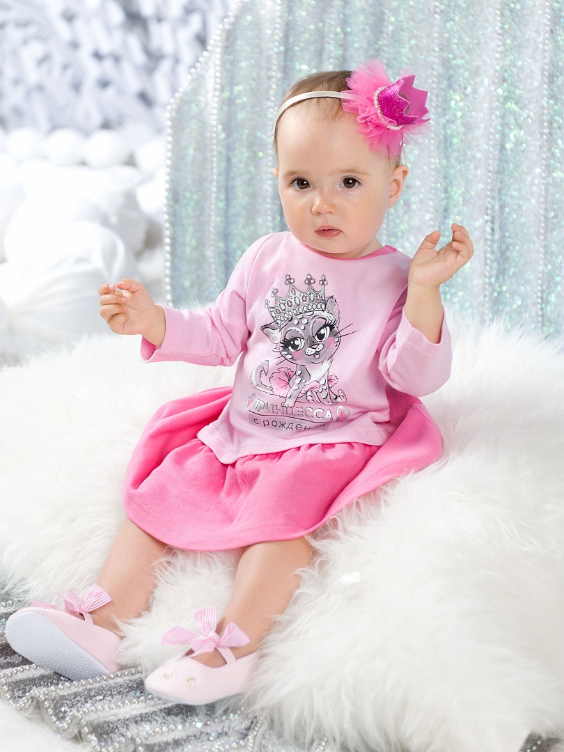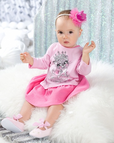Платье для девочек. Новая модель! Полуприлегающий силуэт в верхней части платья и юбка полусолнце. Имитация джемпера с юбкой. Фигурное членение по линии талии с перепадом длин спинки и переда. Центральный принт с серебром в виде глазастого детёныша снежного барса и надпись "Принцесса с рождения!". Горловина обработана контрастной обтачкой. На плече застёжка на две кнопки для удобства надевания. Состав: 100%хлопок