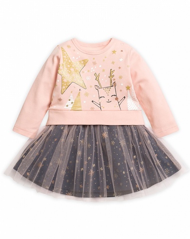 Платье для девочек. Новинка! Имитация нежно розового свитшота надетого поверх пышной юбки. На свитшоте центральный принт выполнен в необычной стилизованной графике, которую дополняет обилие классического и розового золота. Двухслойная юбка. Нижний слой выполнен из основной ткани тёмно-серого цвета с россыпью снежинок цвета классического и розового золота. Верхний слой выполнен из мягкой нежно розовой сетки. Застёжка на плече на две кнопки. Состав: 100%хлопок, вставка: 100%полиамид