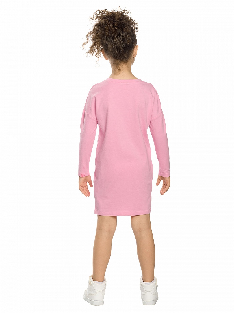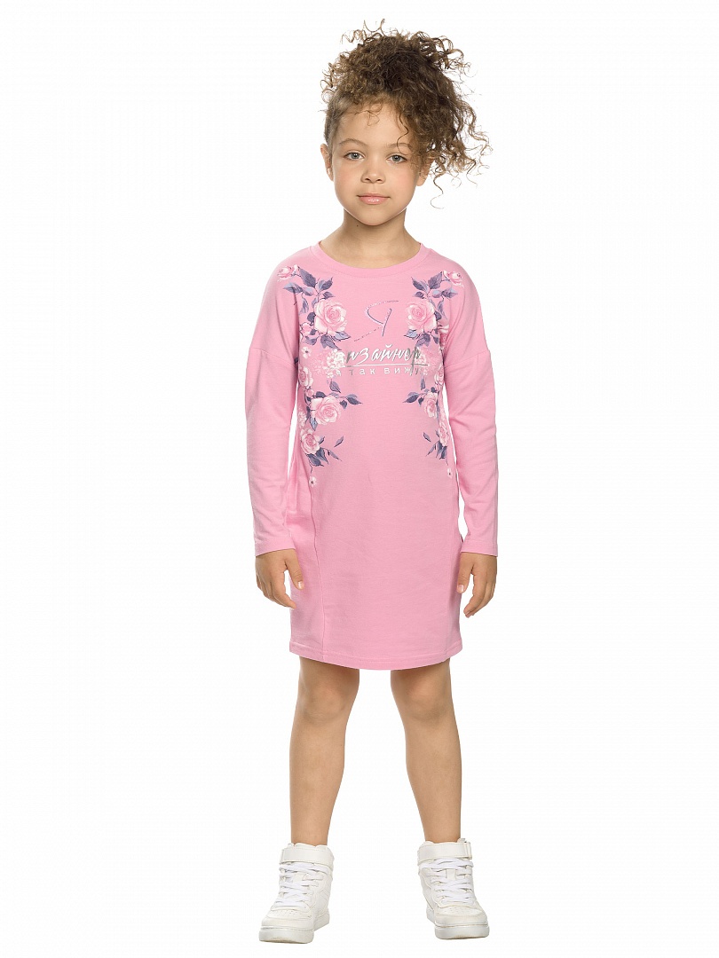 Платье для девочек. Новинка кроя! Платье более зауженного "О" - образного силуэта; длинный рукав, спущенное плечо; боковые швы переведены на перед изделия; надпись "Я дизайнер. Я так вижу!" в сочетании двух блесков: гладкого и фактурного в виде посыпок. Состав: 95%хлопок 5%эластан