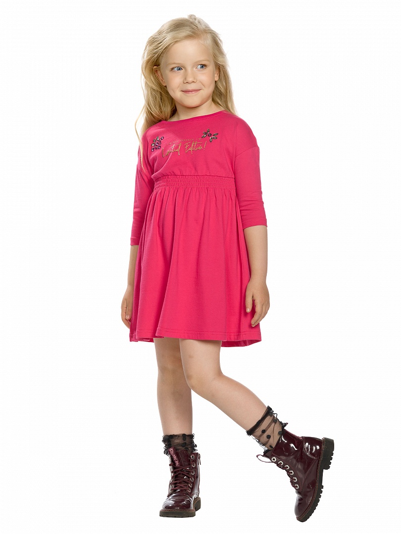 Платье для девочек. Новинка кроя! Увеличенный объём по верху изделия; более спущенное плечо; рукав 3/4, заужен к низу; талия на резинке, слегка завышенная. На передней части изделия аппликация из страз и принт с надписью "Я не совершенство, я лимитированного выпуска". Состав: 100%хлопок