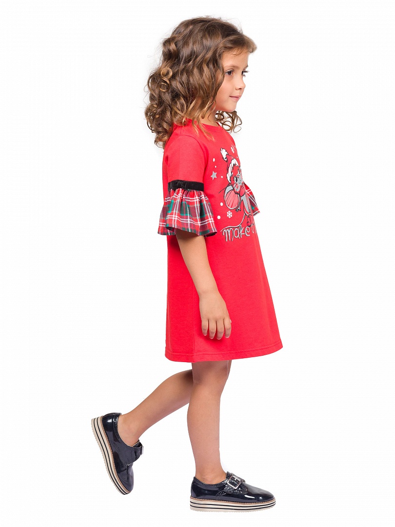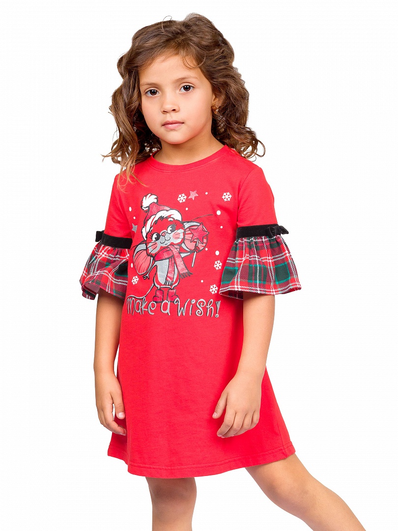 Платье для девочек. Платье А-силуэта с втачным коротким рукавом, по низу которого пришит принтованный волан. По шву соединения рукава с воланом настрочена бархатная тесьма и декоративный бантик. Центральный принт с разноцветным глиттером в виде символа года мышонка и надпись. Перевод надписи «Загадай желание!». Состав: 100%хлопок
