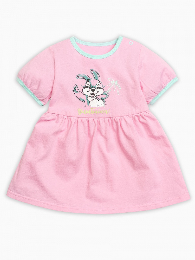 Платье для девочек. Нежное розовое платье свободного силуэта, слегка присборенное по талии. Рукав-фонарик, застёжка на две кнопки на плече. Отделка горловины и манжет рукавов из основной ткани контрастного цвета. Центральный принт: весенний кролик, отрисованный в скетчевом стиле, и надпись "Улыбайся". Состав: 100%хлопок