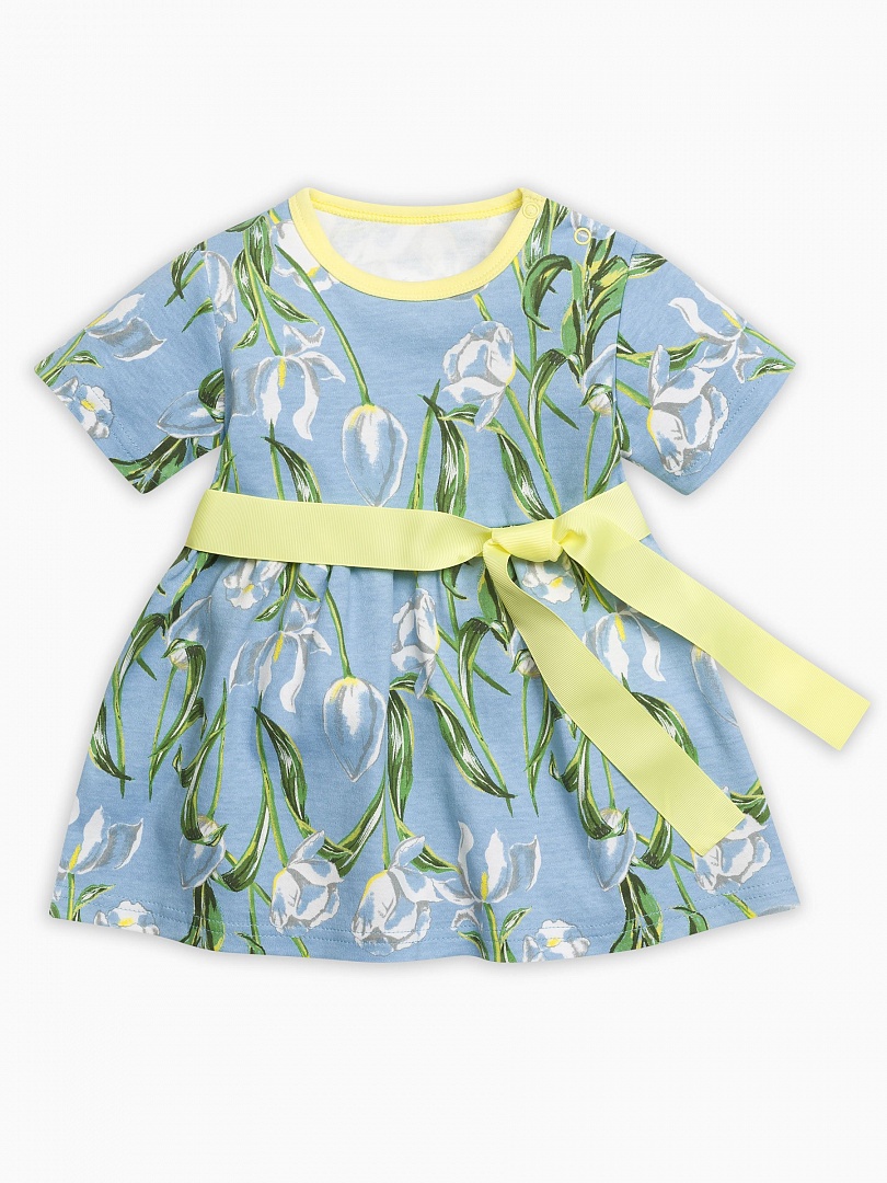 Платье для девочек. Яркое весеннее платье А-силуэта в all over принт с сочными тюльпанами. Отделка горловины из основной ткани контрастного цвета, в районе груди платье декорировано лентой с лаконичным бантиком в тон отделки горловины. Застёжка на кнопки на плечевой части изделия. Состав: 100%хлопок