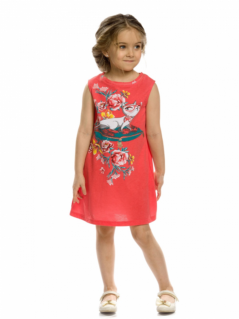 Платье для девочек. Платье-майка трапециевидного силуэта. Платье без рукавов, длина плеча и линия проймы аккуратно прикрывают плечи и создают мягкий девичий образ. Простой, лаконичный крой платья дополнен ярким OVERSIZE принтом на весьперед изделия. Состав: 60%хлопок 40%полиэстер