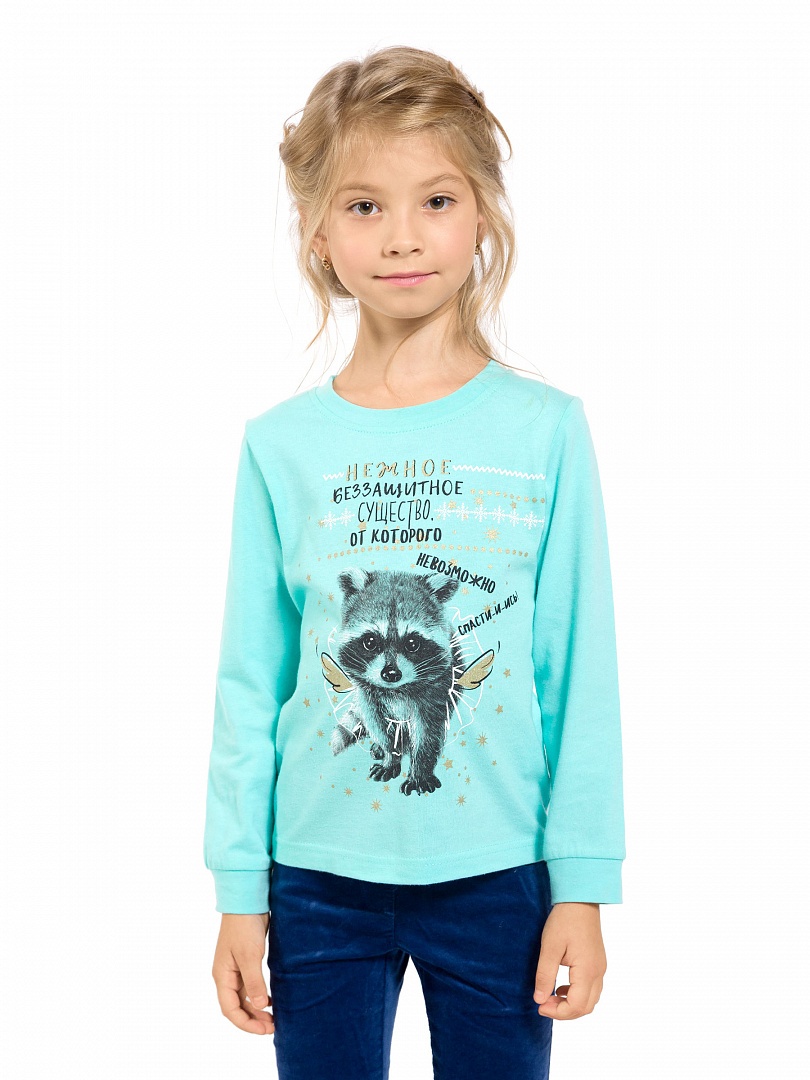 Джемпер для девочек. Классическое джерси. Центральный принт с золотистыми переливающими блёстками в виде милого енота и надпись "Нежное беззащитное существо, от которого невозможно спастись!". Состав: 95%хлопок 5%эластан