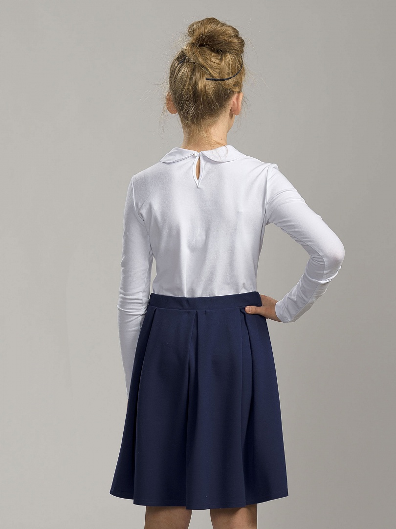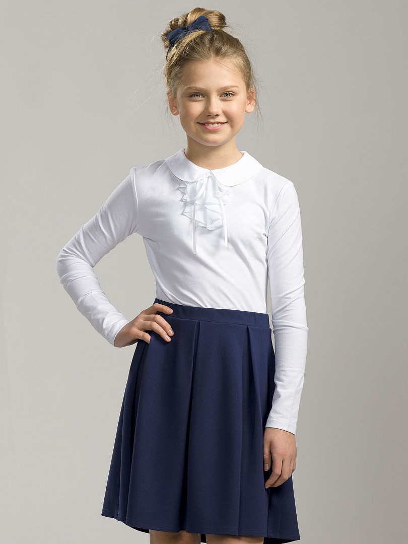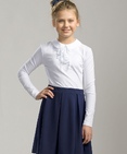 Джемпер для девочек. Новая модель джемпера с нежным жабо из сетки и дополненным бантиком из узкой ленточки, с отложным воротником из швейной ткани. По спинке застежка «капелька» на одну пуговицу. Состав: 93%хлопок 7%эластан, вставка: 85%нейлон 15%эластан, вставка: 60%хлопок 40%полиэстер