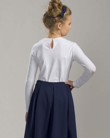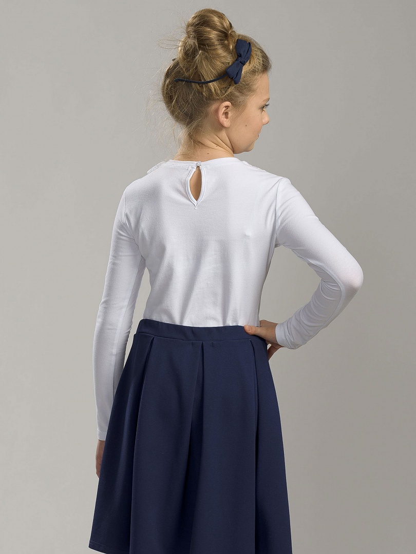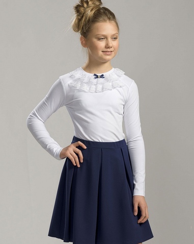 Джемпер для девочек. Новая модель джемпера. Фишка в красивом кружеве, которое создаёт нежную кружевную «пену» в воротниковой зоне. Законченность изделию придаёт маленький нежный бантик из бархатной тесьмы. Для удобства надевания сзади выполнена застежка на пуговицу. Состав: 93%хлопок 7%эластан, вставка: 100%полиэстер