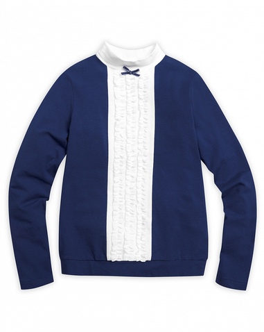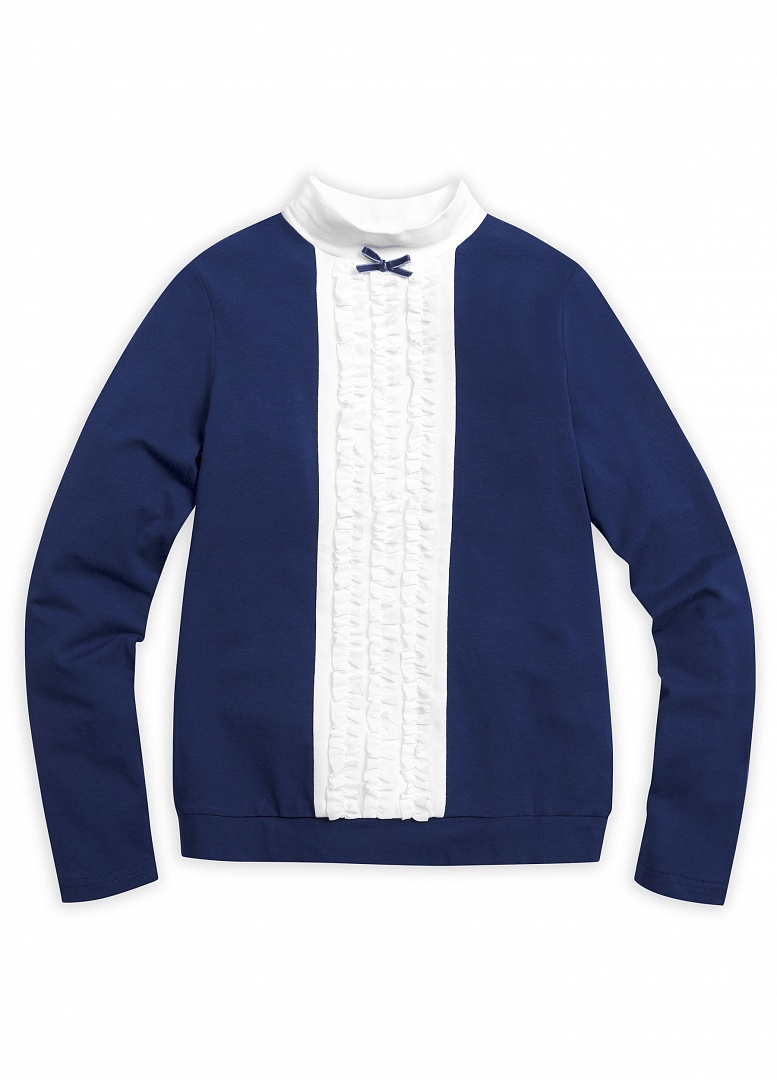 Водолазка для девочек. Новый силуэт: увеличенный объём по груди, низу и рукавам. По низу водолазки манжета из основной ткани, которая имеет достаточную растяжимость. На передней части изделия, по центру вертикальная белая вставка с настроченными на неё в три ряда рюшами из сетки (ширина 2 см.). Воротниковая зона декорирована бархатным бантиком. Коллекция - школа. Состав: 93%хлопок 7%эластан, вставка: 85%нейлон 15%эластан