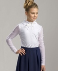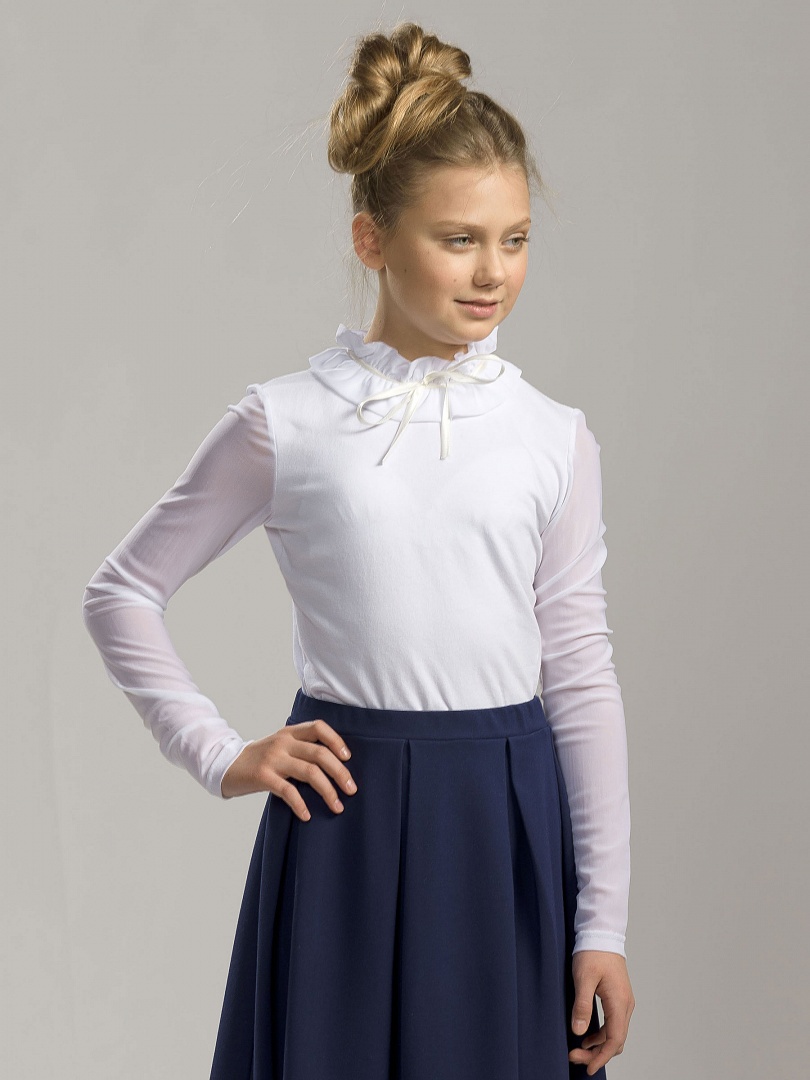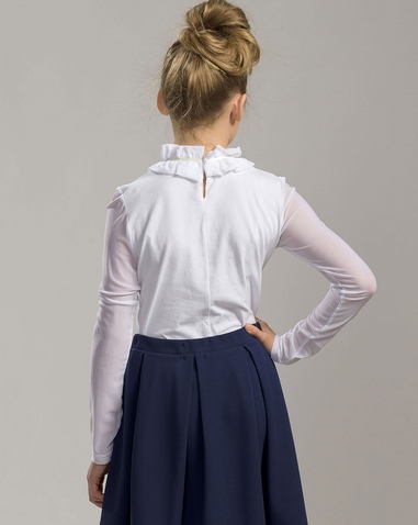 Блузка для девочек. Трикотажная блузка с рукавами и воротником из сетки. Главным элементом в этой модели является необычный воздушный воротник из присборенной сетки, собранный на ленту и завязывающийся на бантик. Сзади выполнена элегантная застежка на пуговку-бусинку. Состав: 93%хлопок 7% эластан, вставка: 85%нейлон 15%эластан