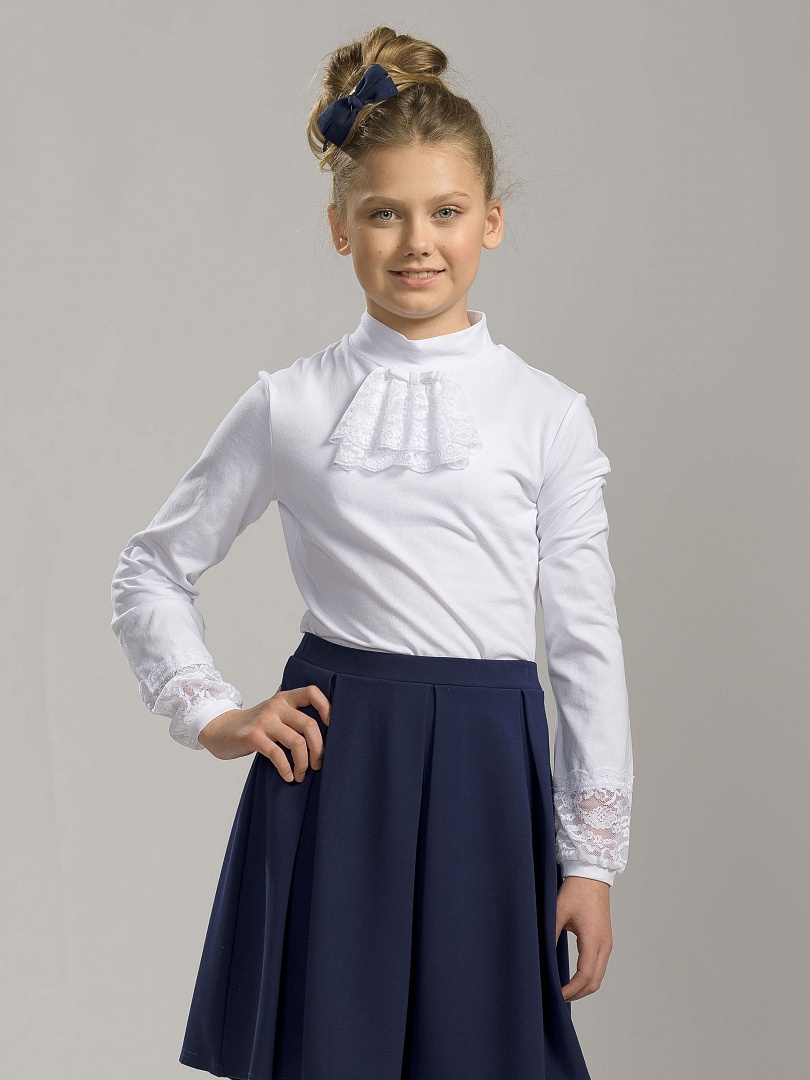 Джемпер для девочек. Модель джемпера, которая подходит как для повседневной носки, так и для торжественных школьных случаев. Неоспоримая романтика и нежность: по низу рукава вставка из широкого кружева с узкой изящной манжетой, которая собирает умеренно расширенный к низу рукав. Воротник-стойка украшен легким кружевным жабо и маленьким бантиком. Состав: 93%хлопок 7%эластан, вставка: 90% полиамид 10%эластан