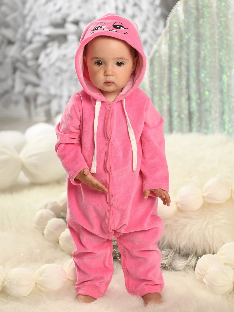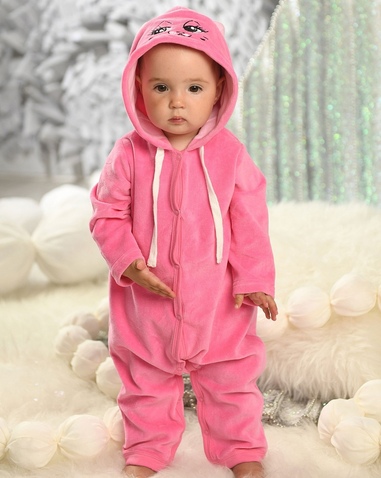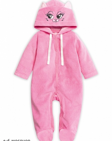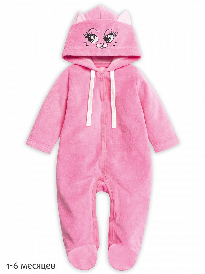 Комбинезон для девочек с капюшоном. Уютный и мягкий комбинезон из хлопкового велюра. Застёжка на кнопки по центру изделия и по ножкам. Одношовный капюшон с регулировкой объёма в виде шнурка. Капюшон декорирован вышивкой в виде кошачьей мордочки и кошачьими ушками. Втачной рукав. Комбинезон имеет два варианта исполнения: с ползунками для возраста 1-6 месяцев и брючками для возраста 6-12 месяцев (низ брючек обработан широким пайпингом). Состав: 80%хлопок 20%полиэстер, вставка: 100%хлопок