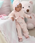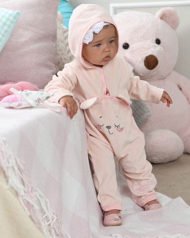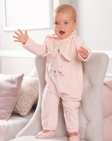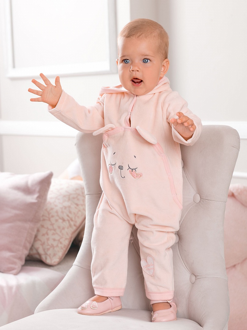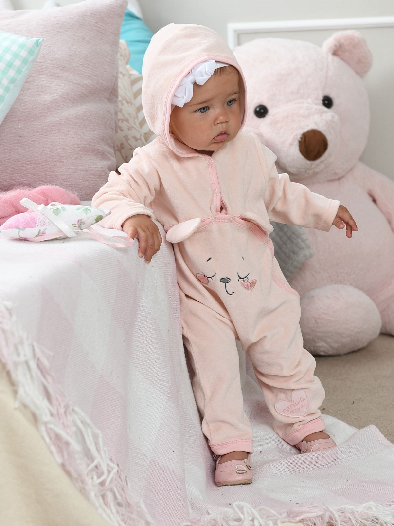 Комбинезон для девочек с капюшоном. Уютный и мягкий комбинезон из хлопкового велюра. На передней части изделия, по центру, функциональная отстёгивающаяся деталь, которая облегчает процесс надевания комбинезона. Деталь декорирована аппликацией с золотом в виде мордочки мышонка, с внутренней стороны которой водорастворимая плёнка, и ушками. Застёжка по центру изделия и отстёгивающейся детали на кнопках. Комбинезон имеет два варианта исполнения: с ползунками для возраста 1-6 месяцев и брючками для возраста 6-12 месяцев (низ брючек обработан широким пайпингом). Состав: 80%хлопок 20%полиэстер