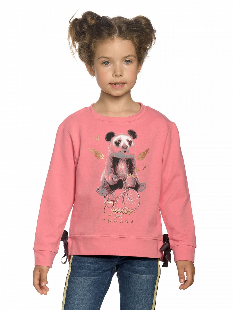 Толстовка для девочек. Новинка кроя! Свитшот из футера объёмной формы, с мягкой слегка спущенной линией плеча; по низу рукавов манжеты; по низу изделия манжеты с перепадом длин переда и спинки; разрезы по боковым швам; в разрезы вшиты репсовые лены, завязывающиеся в банты. Центральный принт с золотым блеском и надписью "Счастье это крылья". Состав: 96%хлопок 4%эластан