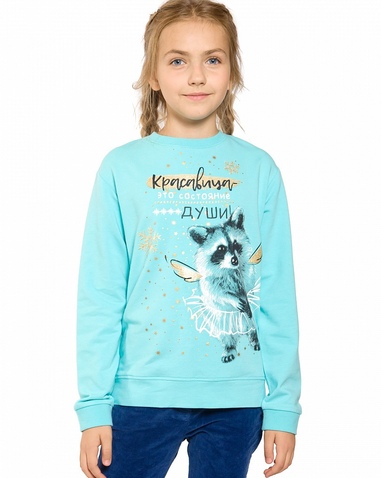 Толстовка для девочек. Толстовка из хлопкового футера. Мягкая линия плеча. Перепад длин переда и спинки, разрезы по бокам. Притачные манжеты из основной ткани по низу изделия. Обработка горловины и манжеты на рукавах из рибаны. Центральный принт с золотистыми переливающимися блёстками в виде милого енота в пачке и надпись "Красавица - это состояние души!". Состав: 96%хлопок 4%эластан