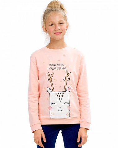 Толстовка среднего объёма, со спущенным плечом. На передней части изделия пушистая аппликация в виде оленя, с обратной стороны которой водорастворимая пленка, и надпись "Поймай звезду - загадай желание!". Манжеты из основной ткани на рукавах и по низу изделия. Состав: 96%хлопок 4%эластан