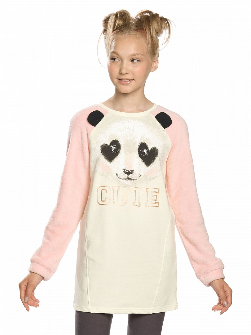 Толстовка для девочек. Сочетание футера и велсофта; рукава и манжеты из велсофта; силуэт "легкий бочонок"; рукав реглан; декоративные ушки. Центральный принт с золотым блеском и надписью "Милый". Состав: 96%хлопок 4%эластан, вставка: 100%полиэстер