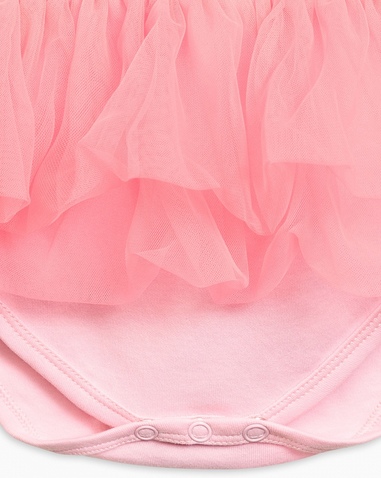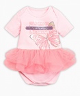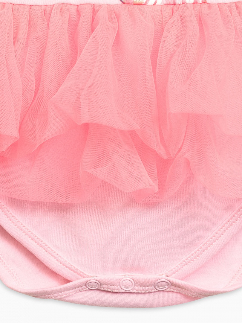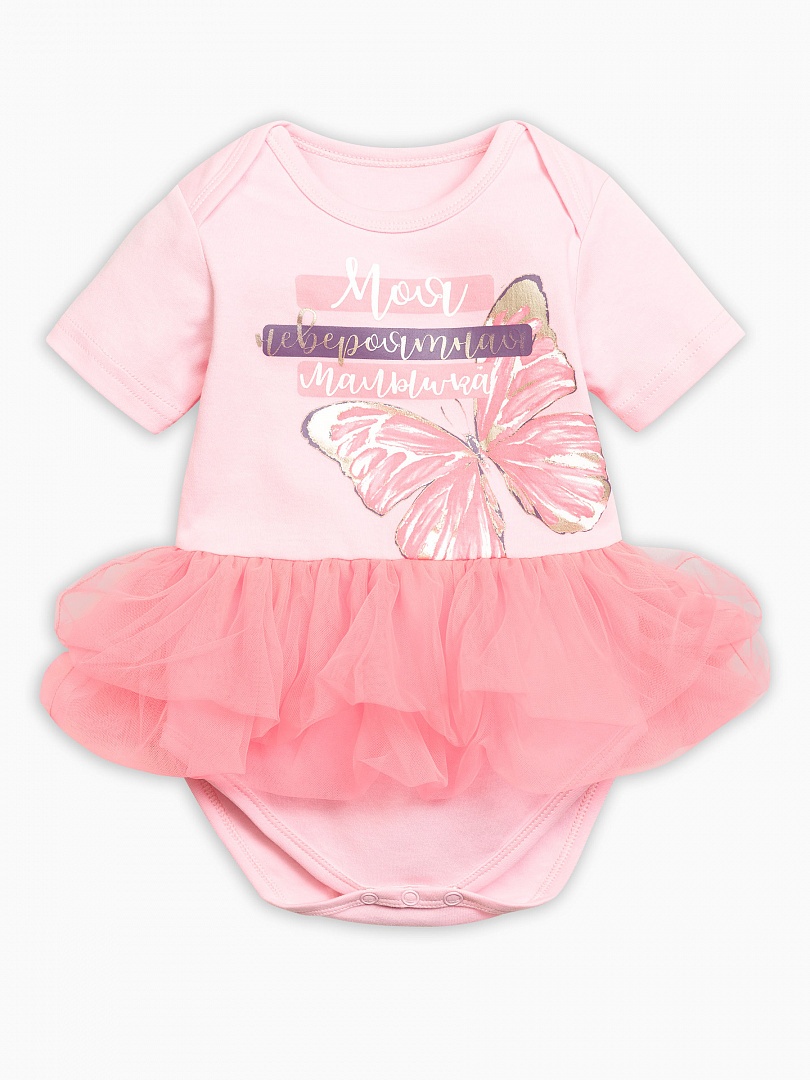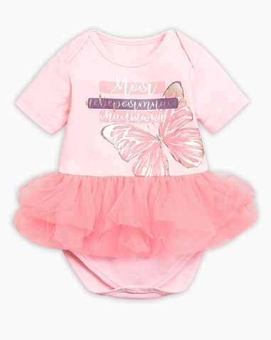 Полукомбинезон для девочек. Выполнен в нежном розовом цвете, застёжка на кнопки в нижней части изделия. Декор из мягкой сетки из фатина, имитирующий балетную пачку. Центральный принт: крупная неоновая бабочка с золотыми переливами и надпись "Моя невероятная малышка". Состав: 100%хлопок, вставка: 100%полиамид