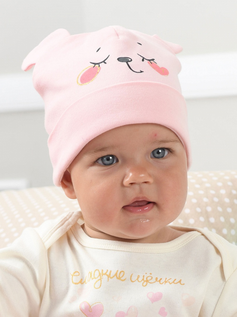 Шапка для девочек. Двойная шапка с отворотом. На передней части изделия принт с золотом в виде мышиной мордочки. Декор в виде ушек. Состав: 100%хлопок