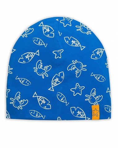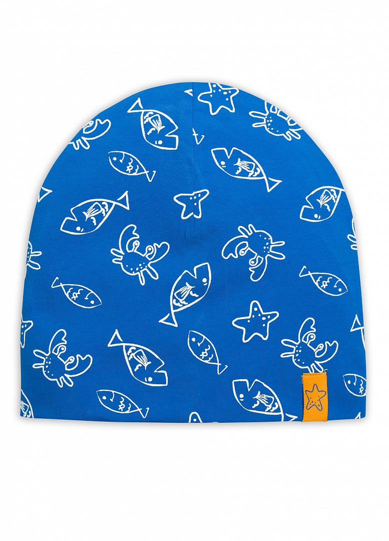 Незаменимая, удобная двойная шапка из эластичного хлопкового материала. По всему изделию принт-рыбки в скетчевой технике, спереди небольшая нашивка. Состав: 93%хлопок 7%эластан
