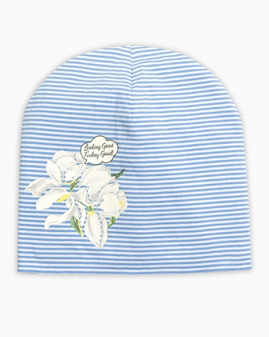 Шапка для девочек. Хлопковый трикотаж с эластаном, двухслойная, без отворота. Принт стойкий, мягкий, первод: "Хорошо выгляжу, хорошо чувствую!" Состав: 95%хлопок 5%эластан