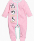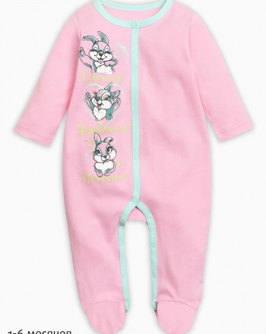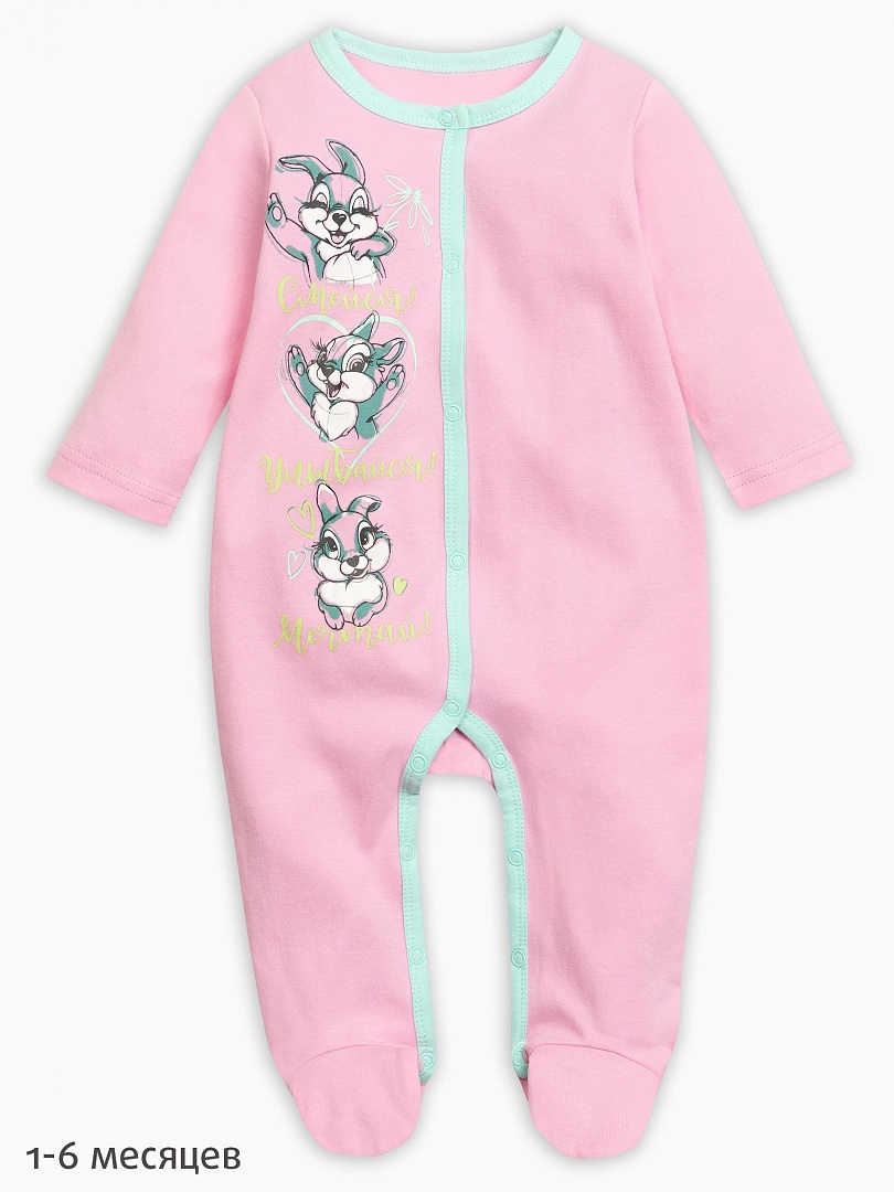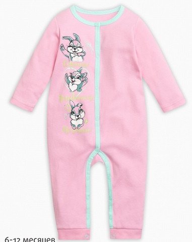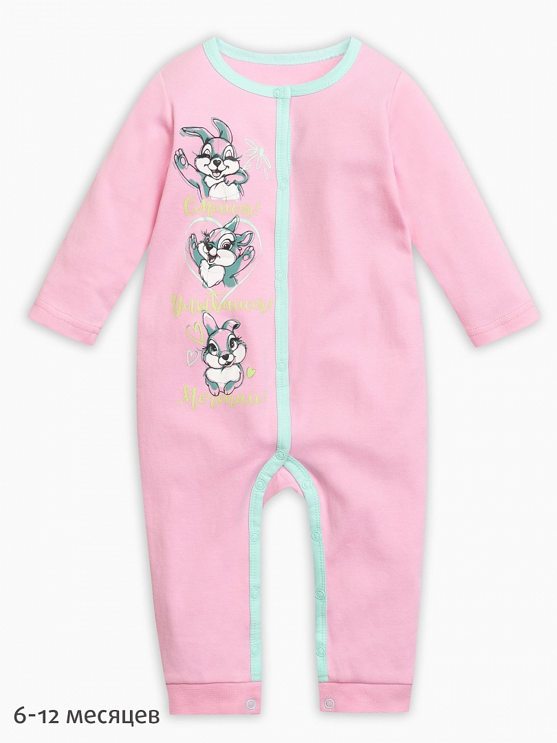 Комбинезон для девочек. Розовый комбинезон из хлопка. Имеет два варианта исполнения: с ползунками для возраста 1-6 месяцев и штанишками (по низу манжеты из основной ткани) для возраста 6-12 месяцев. Застёжка центральная, на кнопки. Отделка горловины и линии застёжки из основной ткани контрастного цвета. На передней части изделия принт: весенние кролики, отрисованные в скетчевой графике, и надписи "Смейся!", "Улыбайся!", "Мечтай!". Состав: 100%хлопок