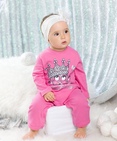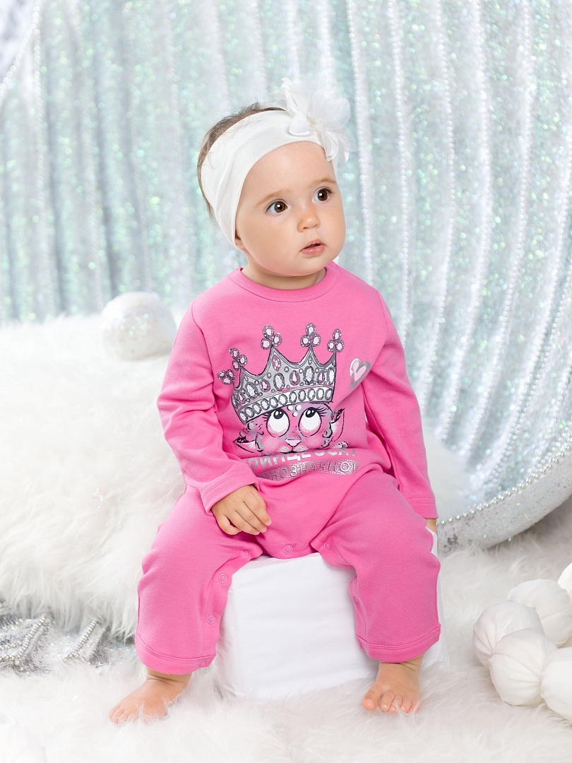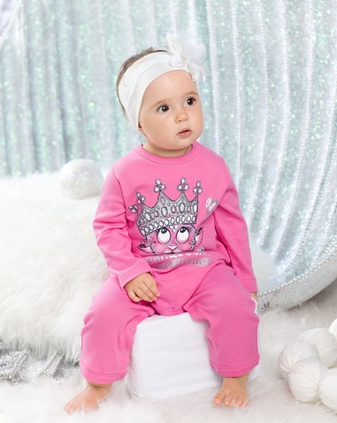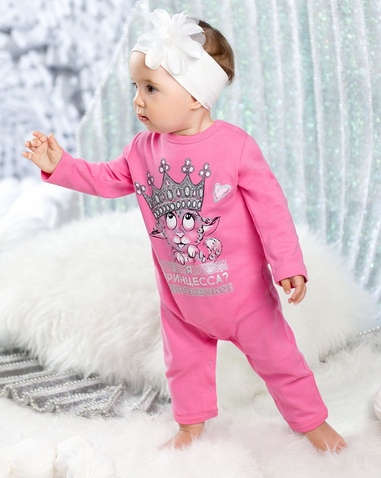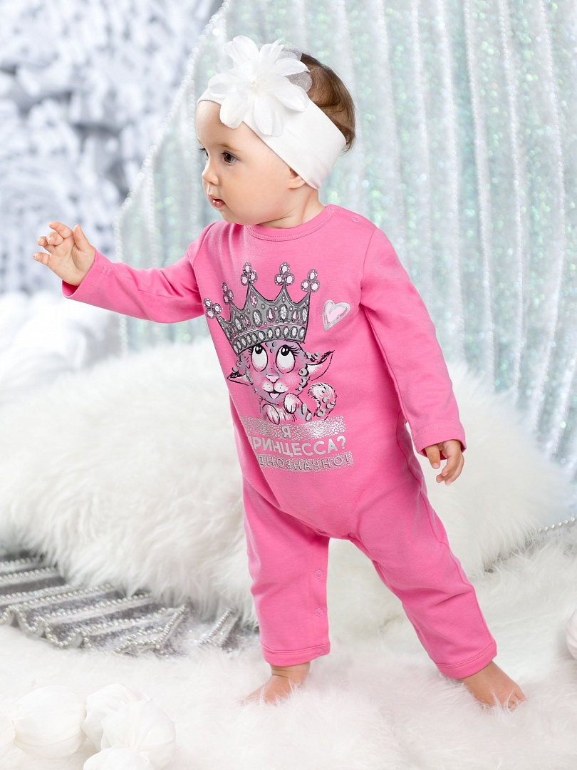 Комбинезон для девочек. Яркий комбинезон с центральным принтом с серебром в виде глазастого детёныша снежного барса и надписью "Я принцесса? Однозначно!". Застёжка на кнопки на плече и по ножкам. Имеет два варианта исполнения: с ползунками для возраста 1-6 месяцев и брючками для возраста 6-12 месяцев. Состав: 100%хлопок