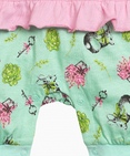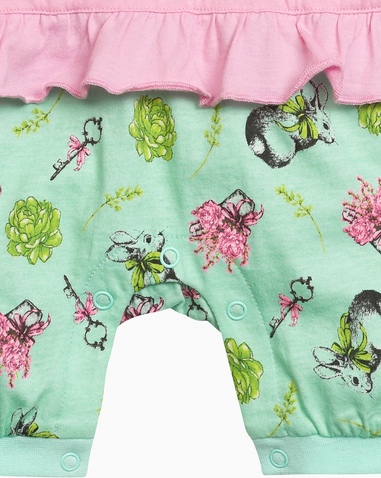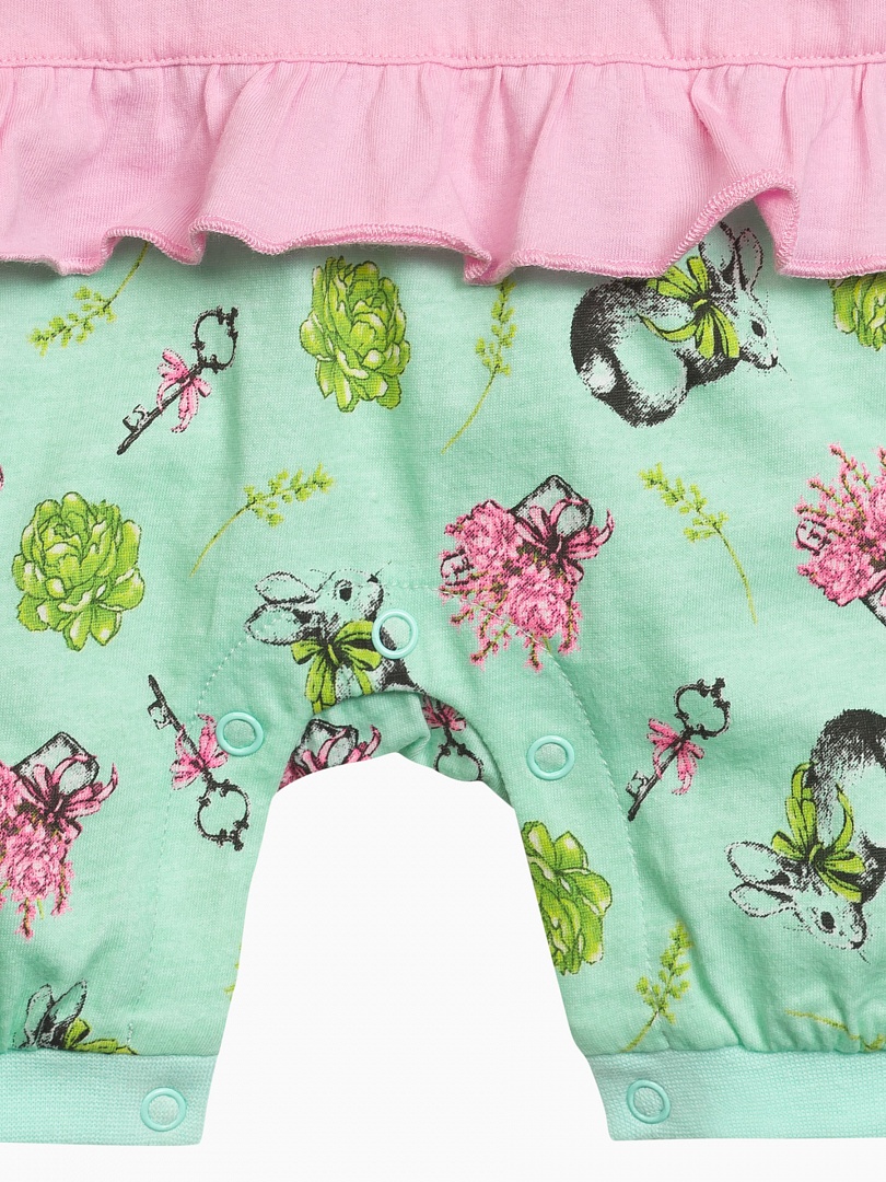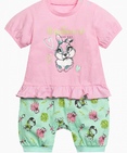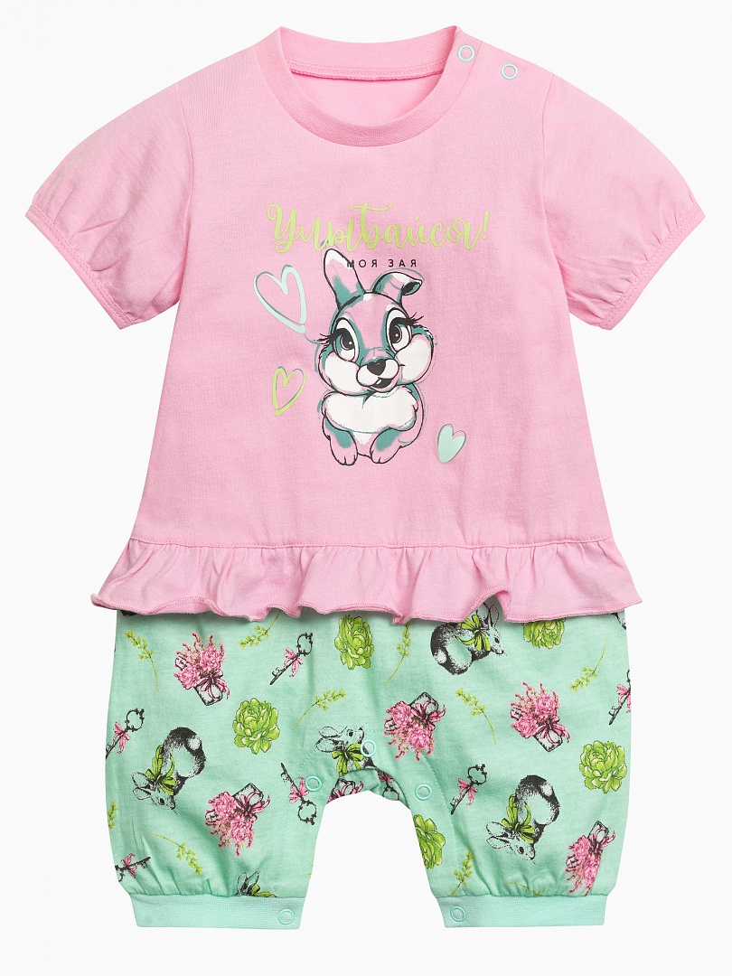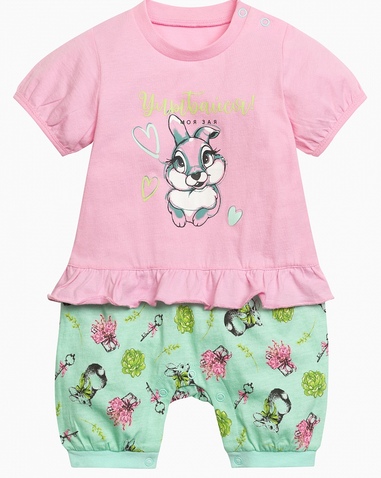 Комбинезон для девочек. Имитация комплекта: футболка и бриджи. Верхняя часть выполнена в розовом цвете. Рукав-фонарик, застёжка на две кнопки контрастного цвета на плече. Комбинезон декорирован оборкой. Центральный принт: весенний кролик, отрисованный в скетчевой графике, и надпись "Улыбайся! Моя зая". Нижняя часть в all over принт в стиле прованс. Застёжка на кнопки "по ножкам", по низу - манжеты из основной ткани. Состав: 100%хлопок