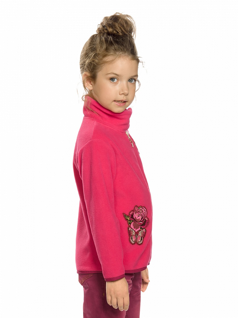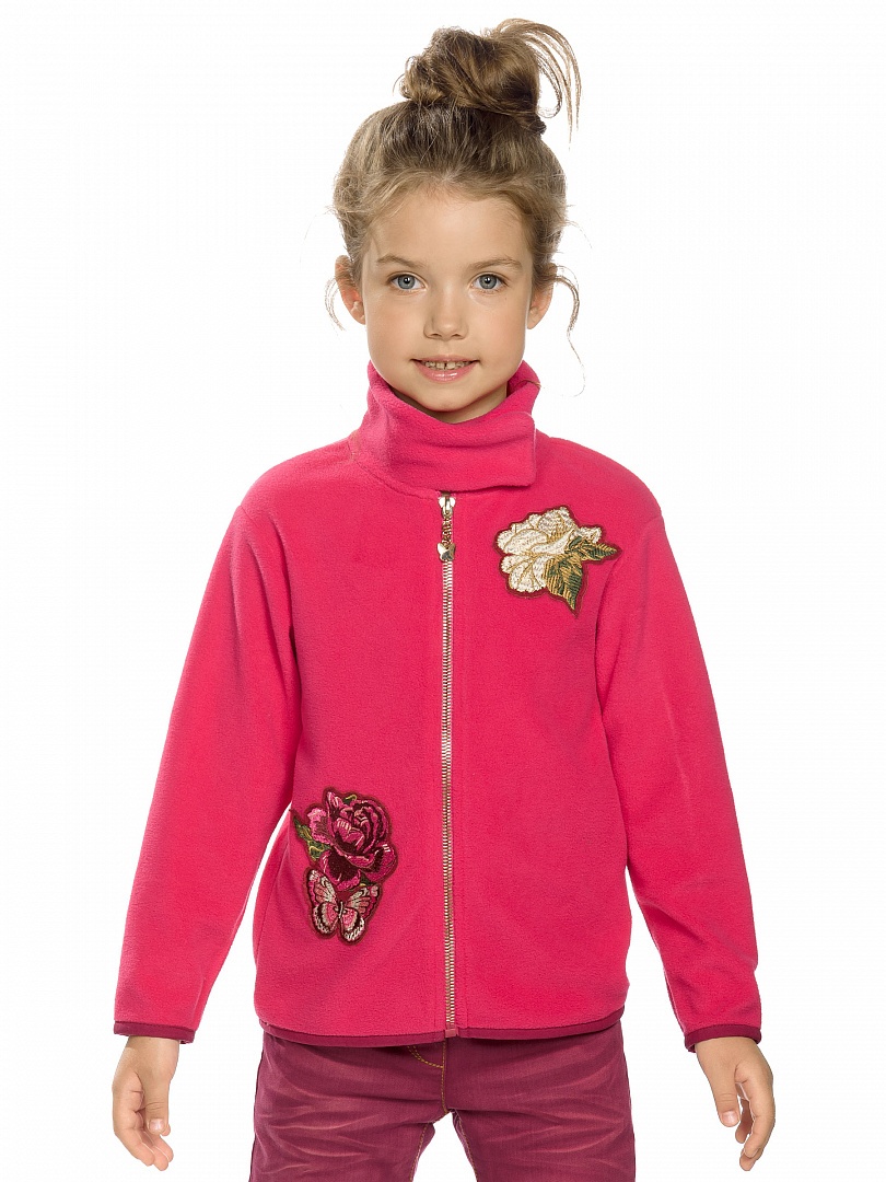 Куртка для девочек. Куртка из флиса; воротник-стойка, застёжка на липе; по низу изделия и рукавов эластичный пайпинг; нашивки; "золотой" пуллер. Состав: 100%полиэстер