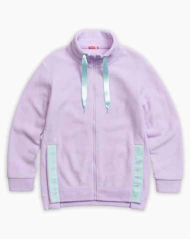 Куртка для девочек. Новинка: прямой, свободный силуэт; спущенное плечо; воротник - стойка декорирован атласной тесьмой; боковой шов изделия слегка переведен вперед; в нижней части шва разрез, который декорирован настроченной тесьмой с текстом. Состав: 100%полиэстер
