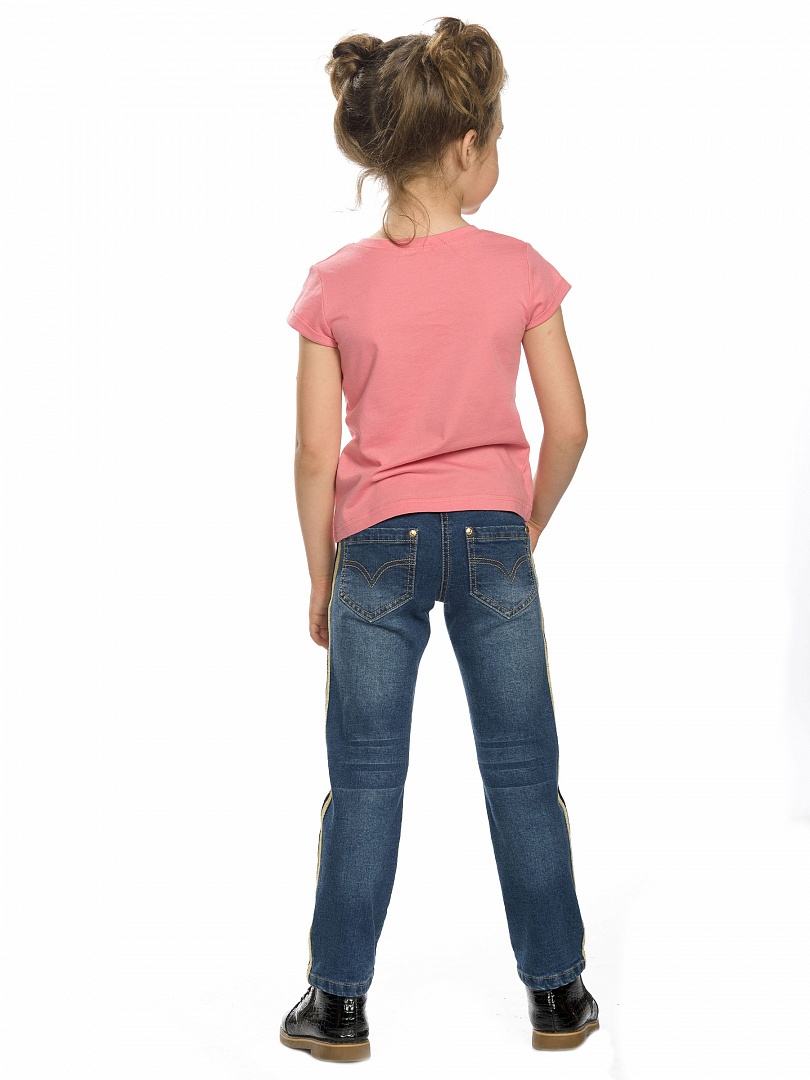 Брюки для девочек. Новинка! Утеплённые джинсы прямого силуэта из эластичного денима с начёсом; металлическая фурнитура; по боковым швам настрочена эластичная трикотажная тесьма с золотым блеском; пояс из рибаны с регулировкой ширины. Состав: 68%хлопок 30%полиэстер 2%эластан