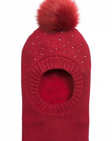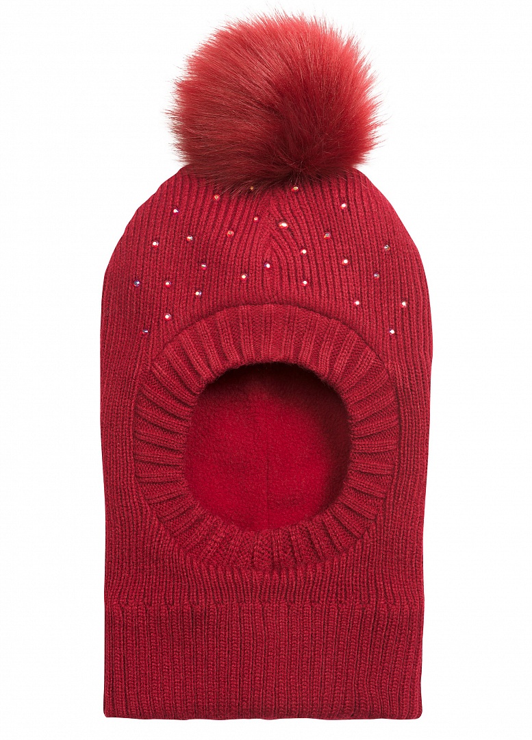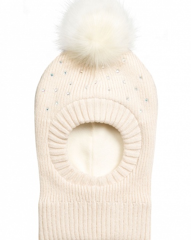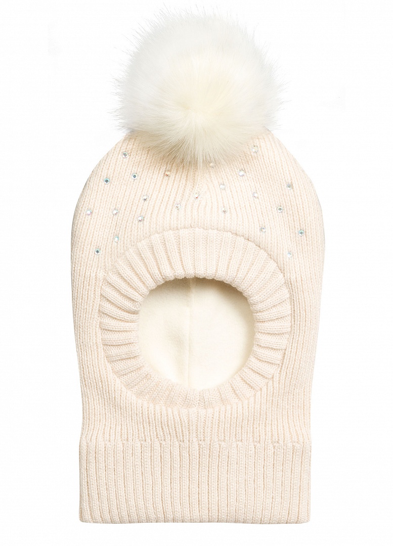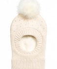 Шапка вязаная - капор; декоративные стразы, помпоны из искусственного меха. Состав: 100%акрил, подклад: 100%полиэстер
