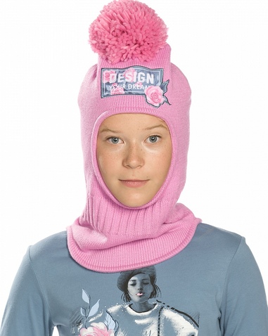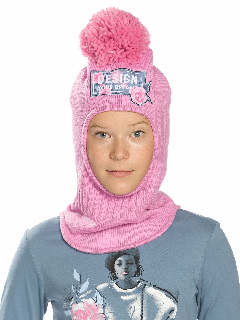 Шапка для девочек. Вязаная шапка-шлем, нашивка с надписью "Дизайн твоей мечты"; помпон из ниток. Состав: 100%акрил, подклад: 100%полиэстер