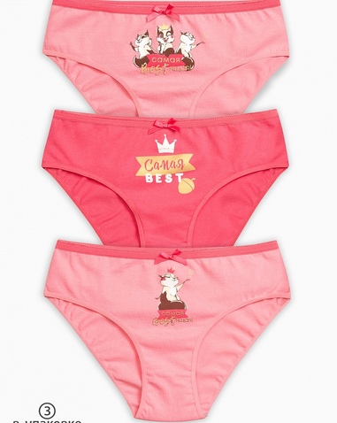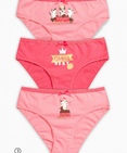 Трусики-слипы для девочек. Комплект из 3-х трусиков. Цвета: розовый и малиновый. По талии эластик с фестонным краем, декор - атласный бантик. Центральный принт с золотом. Состав: низ: 100%хлопок, низ2: 100%хлопок, низ:3 100%хлопок
