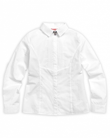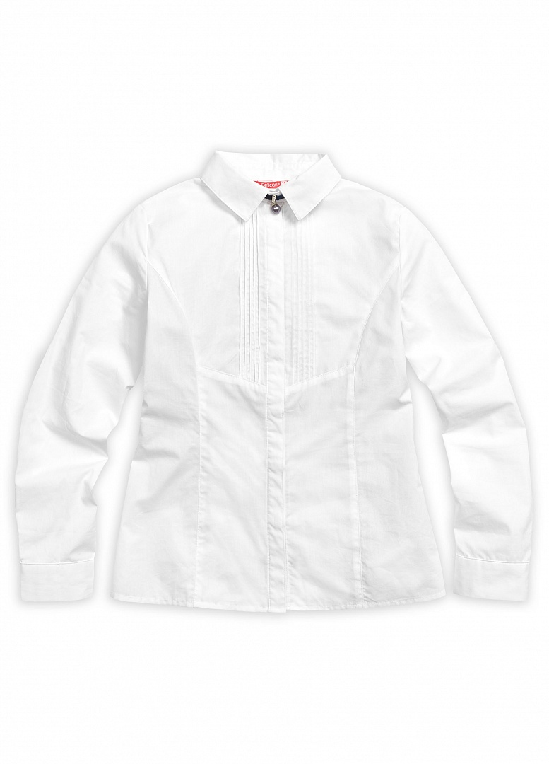Блузка для девочек. Новый элемент: на передней части изделия вертикально застроченный узкие складки, которые уходят в подрез. Скрытая застёжка. Воротник классической формы с заострёнными уголками. В области воротника съёмный декоративный элемент (чокер) с перламутровой бусиной. Коллекция - школа. Состав: 60%хлопок 40%полиэстер