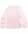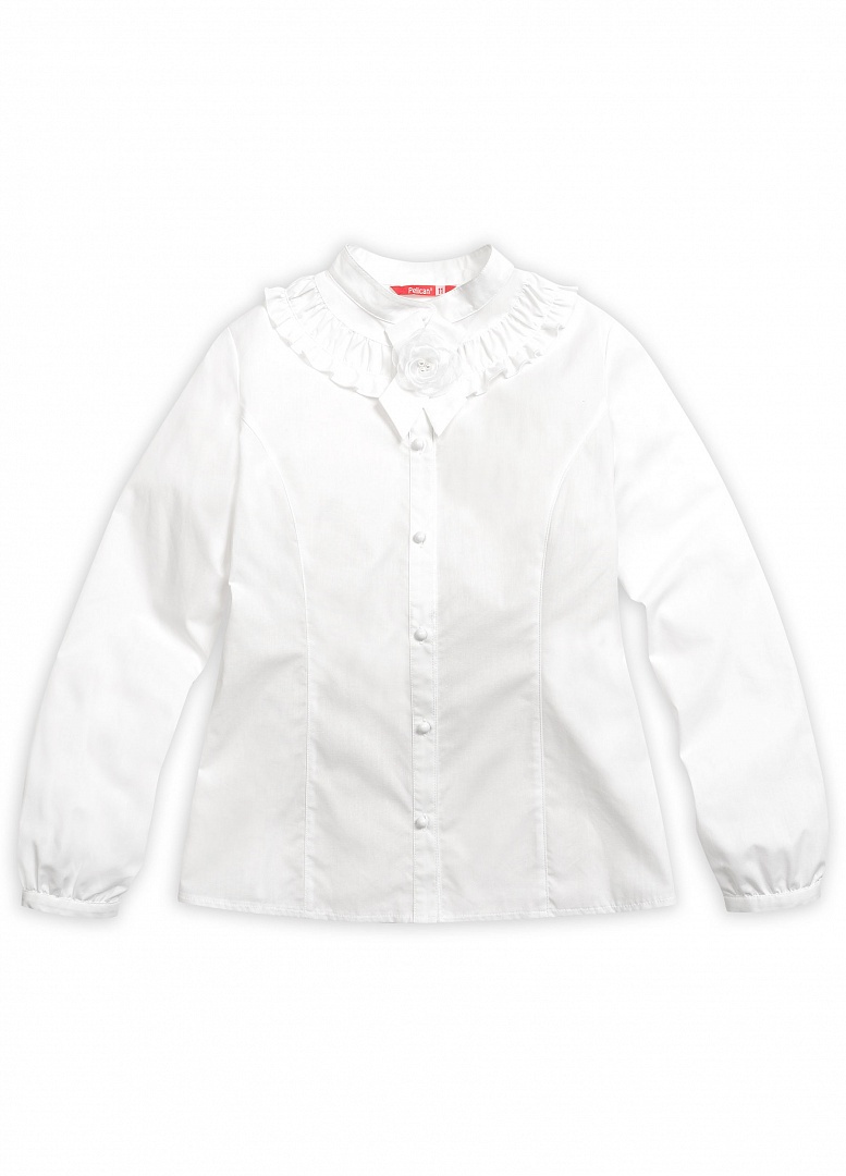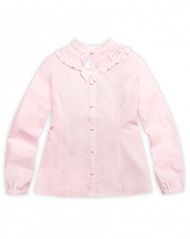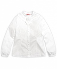 Блузка для девочек. Классическая блузка с длинным рукавом на узкой манжете. Воротник-стойка и декоративная сборка с рюшей в воротниковой зоне. Съёмный элемент в виде шикарной розочки из органзы на ленточке из основной ткани, крепится на пуговицу на планке. Коллекция - школа. Состав: 60%хлопок 40%полиэстер